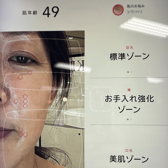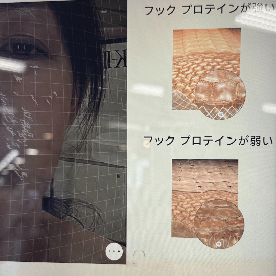 肌診断の結果は49歳でした。マイナス5歳はだ✨✨キラキラポイントも前回よりアップしていました。ただ、ほほのトップが理想の高さより1せんち下がっているそうで、フックプロテインが弱いことがわかりました。