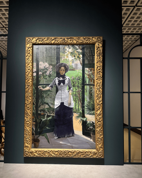 明るい戸外から暗い音質へと足を踏み入れるのは画家の妻プロスペリーです。彼女が纏う水玉と縞模様のドレスは1880年初頭の夏に流行したものですが、現在も綺麗に保管され展示されていました。1887年に病に倒れた妻の絵画だけでなく、このドレスも終生手放さずにいたそうで、夫の愛の深さを感じますね。