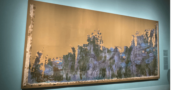 水面に浮かぶ睡蓮と水面に映る空の青や雲の白などの反射に焦点が当てられた作品で、白内障の進行により、荒々しい筆使いやより濃く、強い色彩が用いられる傾向にありました。この頃からオランジェリー美術館に収められることになる巨大な装飾画の制作に本格的に着手しました。