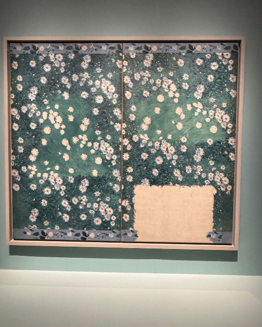 カイユボットは、セーヌ河岸のプティ=ジェネヴィリエに移り住み、邸宅の庭で様々な植物を育成し、モネと園芸への情熱を共有しました。本作品は、画家の詩により未完成のまま残されました。画面全体にヒナギクが散らされる様は、後にモネが水面で画面を覆うことになる睡蓮の大装飾画に通じるものがあります。