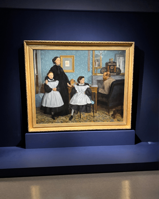 描かれているのはドガの叔母一家。叔父のベレッリ男爵の政治活動によってフィレンツェで亡命生活を送っていました。黒い喪服を纏い、堂々と立つのが叔母。そばにかかっているのはなくなったばかりの父親の肖像画です。長女は行儀良くこちらを見つめ、次女は片足を座面にあげて座りお転婆そう。一方、叔父は部屋の片隅で椅子に身を沈め居心地が悪そう。このフォーマルな肖像画には常に幸福とは限らない家庭の実態が映り込んでいます。