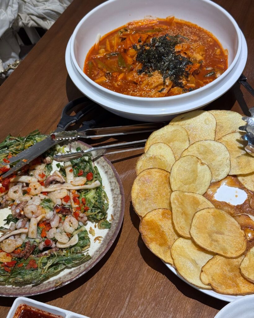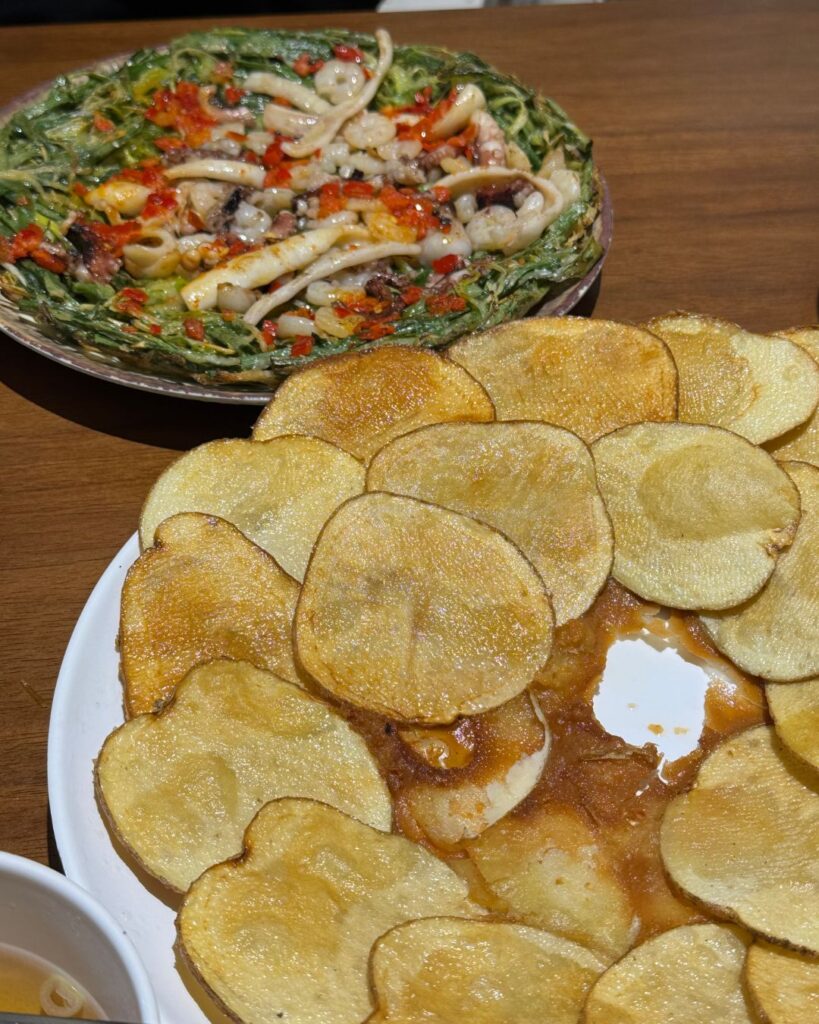 こちらがポテトパンケーキとグリーンオニオンパンケーキです!スライスしたジャガイモの重ね焼きとニラの上にたっぷりのシーフードがのっかったチヂミです。運ばれてきた時大きすぎて笑いが出てしまいましたwこのボリュームも魅力の一つなのでしょうね!韓国ならでは!ハサミでカットしていただきます。
