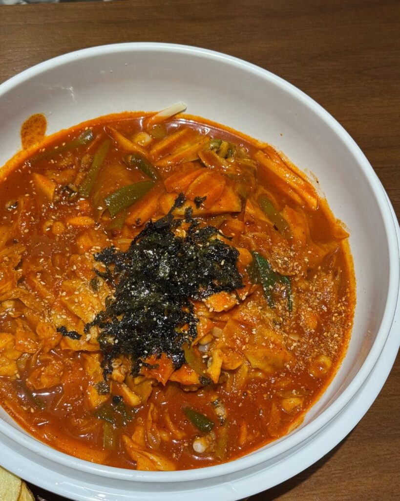 ナクチカルグクスは、平打ち麺の韓国風うどん『カルグクス』にプリプリのナクチ(手長だこ)を贅沢にのせた旨辛い海鮮麺料理です。新鮮なタコと濃厚な辛味スープが特徴で、韓国や日本の新大久保などでトレンドとなっているスタミナ抜群の人気メニューです。