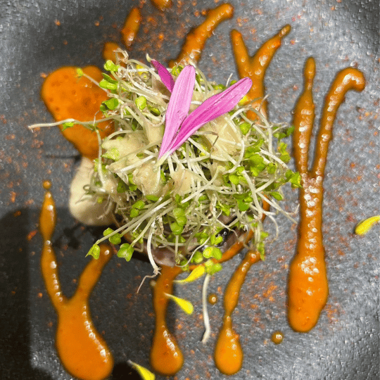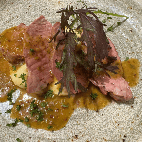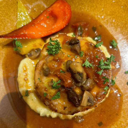 roti(ロティ)は、フランス語でオーブンで焼いたもの=ローストポークのことです。じっくりと火を通すことで仲がしっとりとジューシーでした。シャリキュエールソースは、フランスの伝統的なソースの一つで、ローストポークにあいます。