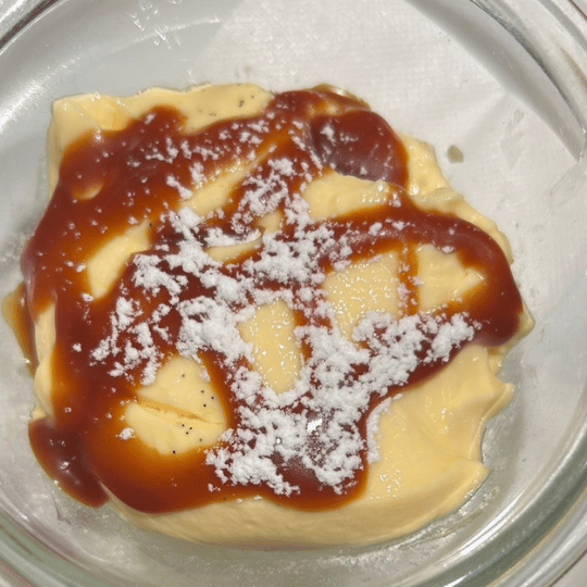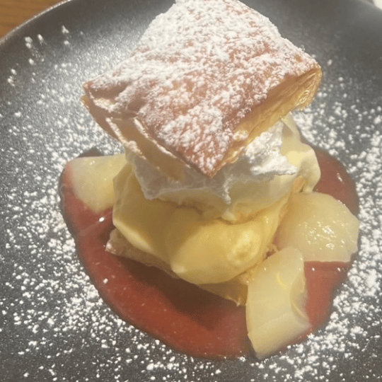 - サクサクに焼き上げたパイ生地にカスタードクリームと洋梨、生クリームをはさみ、上には粉砂糖をフォンダン(糖衣)をかけて仕上げてあります