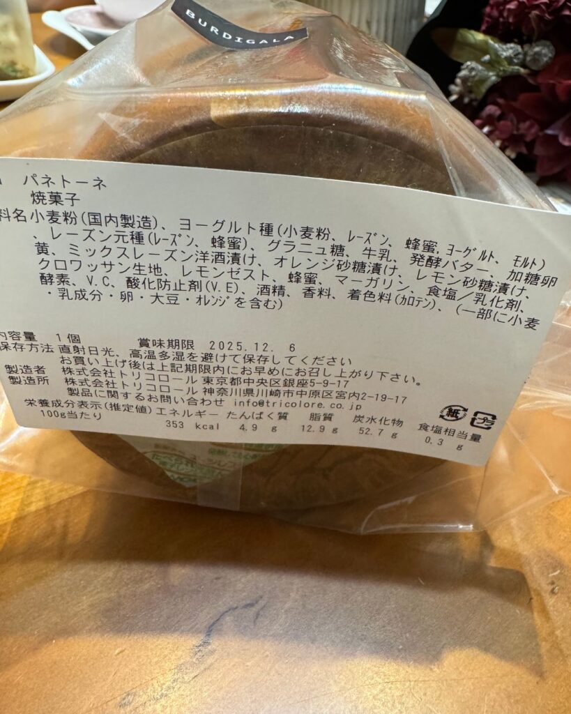 11月12日に購入したパネトーネの賞味期限は12月6日でした。翌日にいただいたのですが、少しパサついているように感じました。もう少し寝かせてから食べた方が良かったのか?クリームやクリームチーズをつけて食べたら美味しさがますかも?と思うhanakoでした。