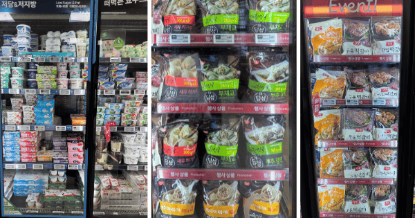 韓国の飲食店は、20時か21時に閉店するお店が多いので、美容外科の後はなかなか時間がなくて食事が摂れません。そこでお世話になるのがロッテマート。なんと24時まで開いています!美味しいキンパやヤンニョムチキン・サラダやギリシャヨーグルトに冷凍食品まで品揃え豊富!ホテルへ持ち帰り、レンジでチンしていただけます。コストコのような大きなカートでお買い物して、レジには自分で並べます。大きなショッピングバッグも購入可能です。