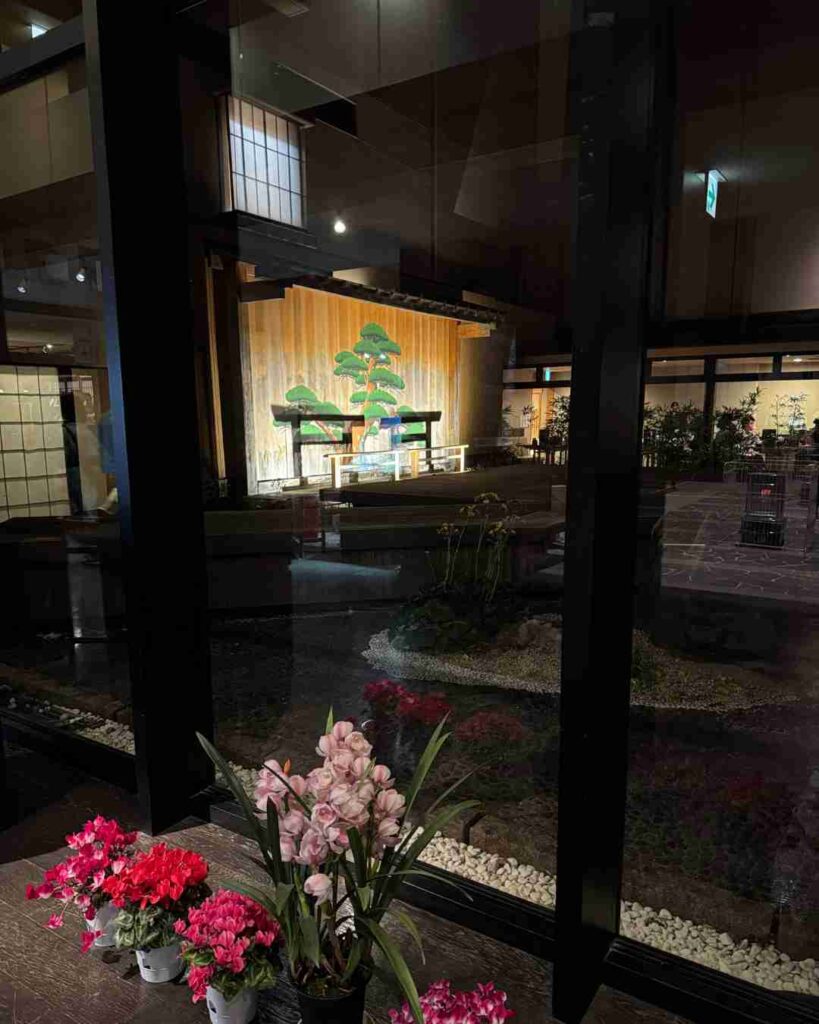 宿に足を踏み入れた瞬間、まず目を奪われたのが竹毬のオブジェ。そして中庭には凛と佇む本格的な能舞台。普通の温泉宿ではなかなかお目にかかれない光景に『特別感・非日常の空間へ来たんだな』と改めて心が躍りました。