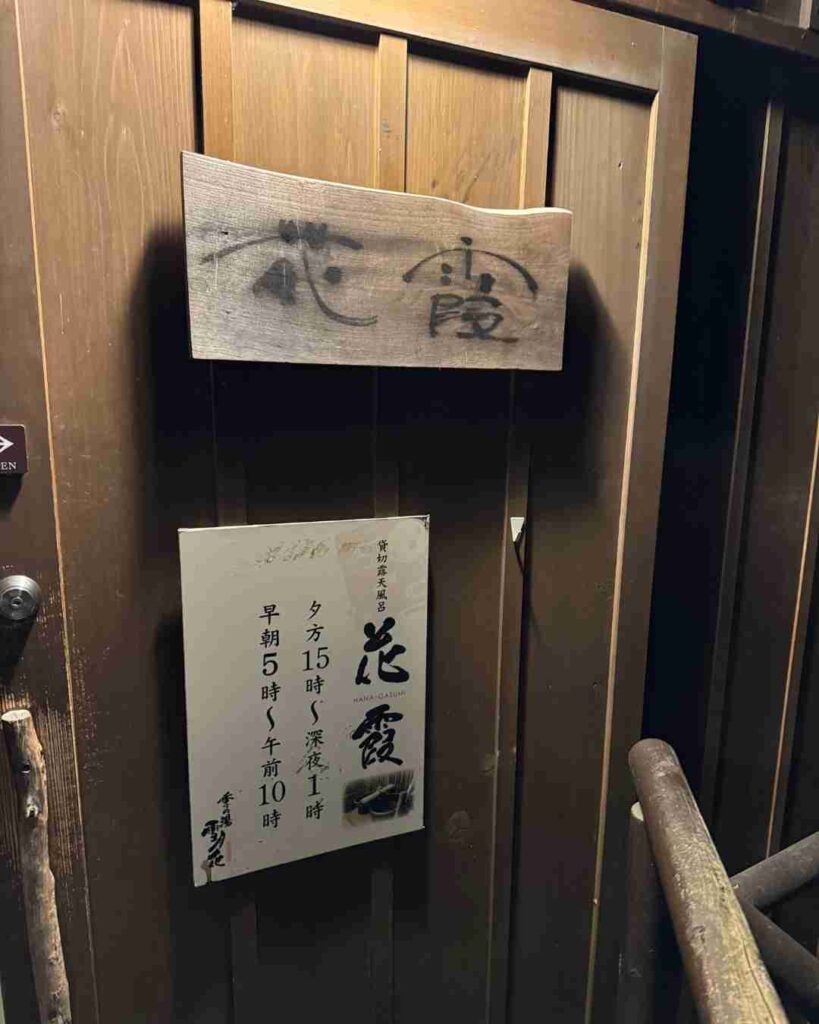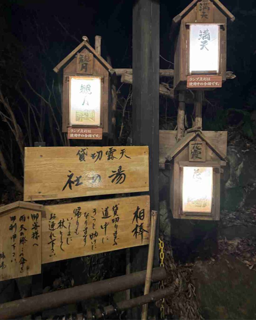 こちらは貸切露天風呂の案内板です。このようにあかりがついていると使用中です。雨の日用に傘の準備もしてありましたが、杖代わりでしょうか?坂道になっているので砂利道お気をつけてくださいという優しい心使いですね?