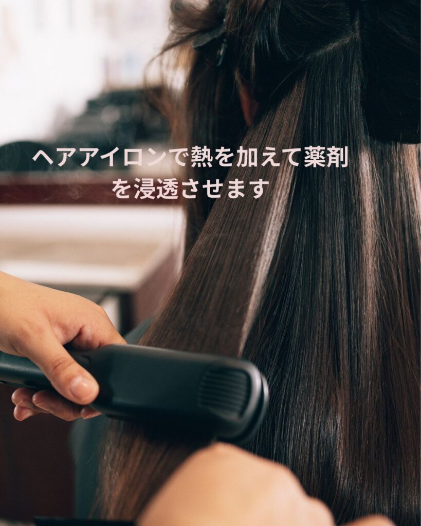 ヘアアイロンで熱を加えて、髪の内部に成分を浸透させます