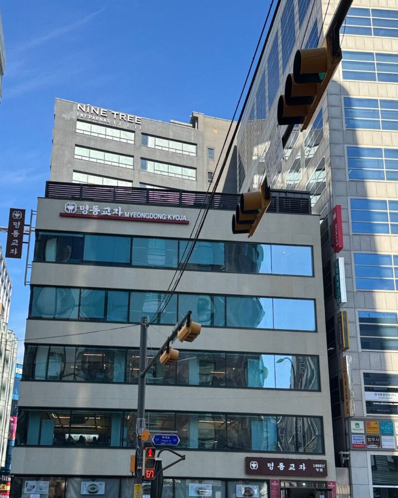横断歩道を挟んで目の前に明洞餃子もございます。10時代ですがもうすでに行列ができていました。ミシュラン獲得で大人気店です。カルグクスとマンドゥが美味しいので是非一度は足を運んでみてくださいね!