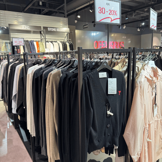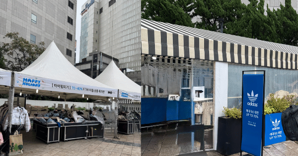 10/05 チュソク直前にお邪魔しました。建物の前の広場では特設会場が設置され、冬物のアウターを中心に最大70%オフセールが開催されていました。子供服から大人まで品数は豊富でした!お気に入りのものが発見できたら嬉しいですよね!
