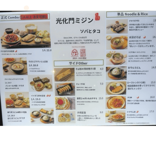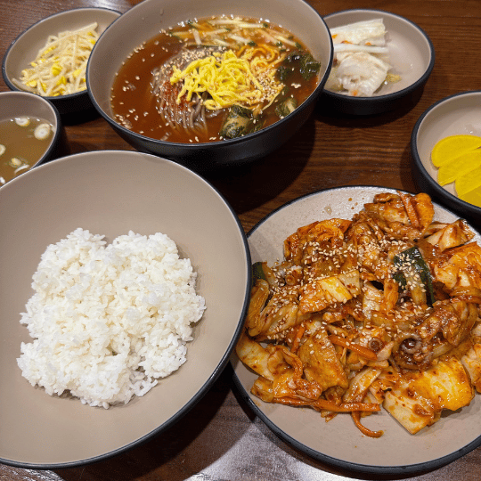 タコが食べてみたくて、ナクサム丼(熱々の焼き味をしっかり生かした手長だこ入りサムギョプサル炒め丼)17000ウォン。水混ぜそば(1945年から続いている濃厚な冷たいスープに包んだそば)辛いソースが入っています14000ウォンをいただきました。リーズナブルですが、美味しくいただきました。