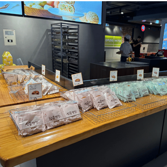 1957年に大邱(テグ)で開業した三松(サムソン)パンチプが地下にございます。とうもろこしたっぷり入とうもろこしパンが大人気らしいですが、コロッケ(油で揚げない揚げパン)シリーズは大人気みたいで20個位買っている方もいました。食パンやあんパンなど他の種類もありましたので、ホテルでの朝食にお買い求めになったら楽しいかと思います。