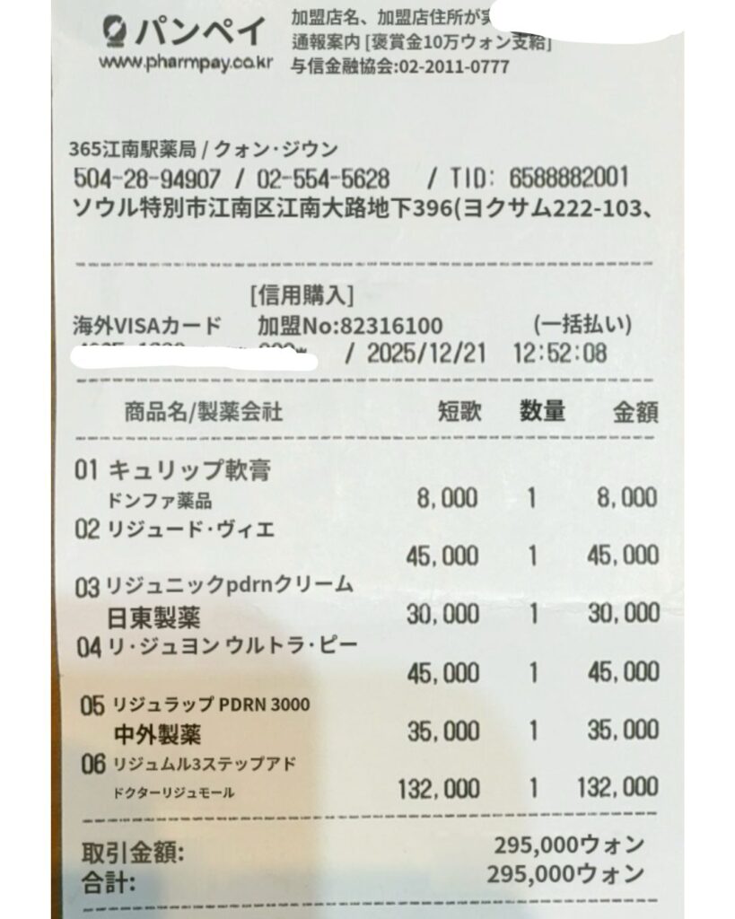 カンナム駅1番出口地下にあります365江南駅薬局で購入したものです。薬剤師さんは、日本語対応は不可でしたのでPapagoで翻訳いたしました。料金はこちらで↓ タックスリファンドはございませんでした。