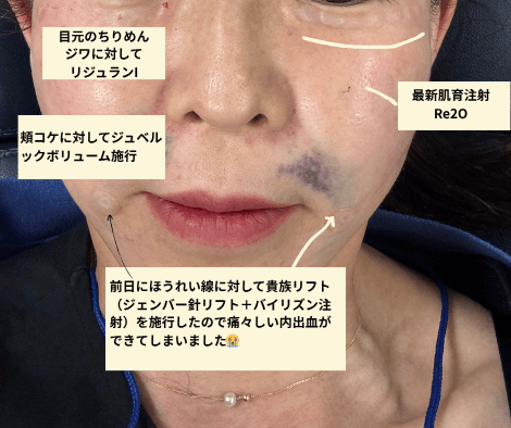 これは痛くて、涙が出そうでした。少量頻回注入なので数十回もしかしたら100回近く針を刺します。細かくうっていくのですが、結構血まみれでした。施術後にしっかりとクーリングをしたならば、内出血があそこまでひどくならなかったのでは?と大後悔の嵐でした。隣のベッドからは、『クーリングしながらやりましょうね!』と聞こえてきたので、もしかしたらクーリングをリクエストできるのかもしれません?もし、皆様が貴族リフトをしたいのならば、クーリングをリクエストするなり、ご自身でアイスパックを持参してクーリングをすることをお勧めします。