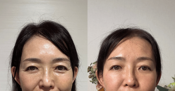 おでこのシワはなくお肌はパンとはっていますね。目の重さは、もう少し残っているようです。中顔面がふっくらしたことで、ゴルゴラインが改善されたようで嬉しい変化です。目は重く、バニーラインを改善したいですね!