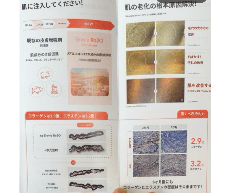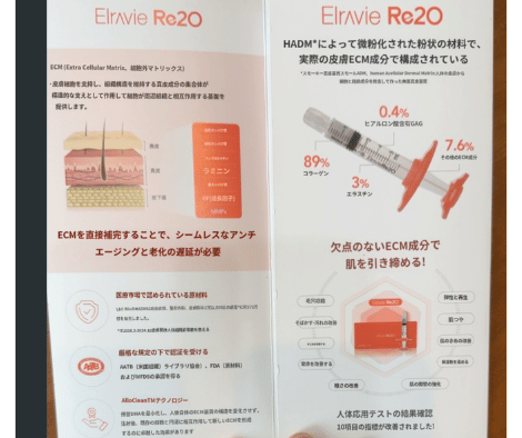 人の皮膚由来のスキンブースターで、(初のECM;細胞外マトリックス)成分はヒアルロン酸0.4% コラーゲン89% エラスチン3% その他ECM成分7.6%