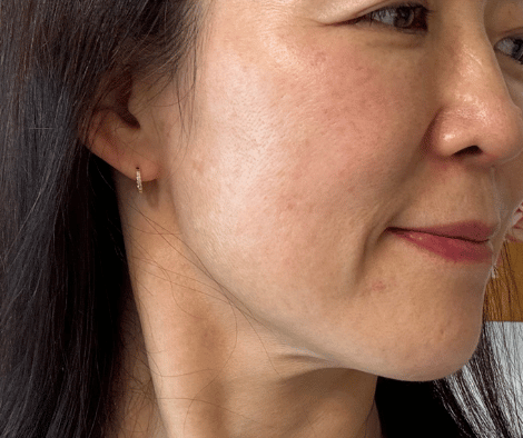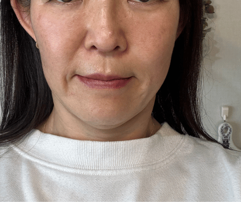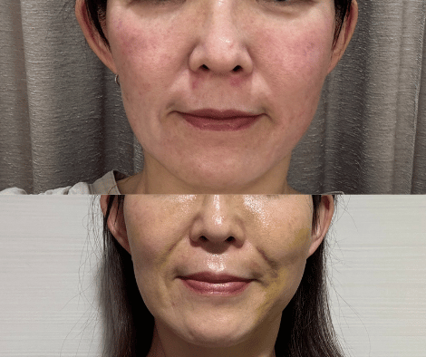 施術後1週間のお顔です。ほうれい線部はうっすら内出血が残っています。お顔全体のむくみはへり、肌の艶感はありますね!赤ら顔が改善されているようにも見えます。