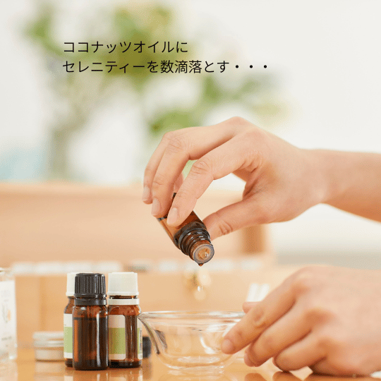 ココナッツオイルなどのキャリアオイル30m l+セレニティー6〜7滴を混ぜ合わせ、お腹周りや足の裏、手のひらのツボをマッサージします。特に足の裏は全身のツボが集中しているので、オイルマッサージがおすすめです。