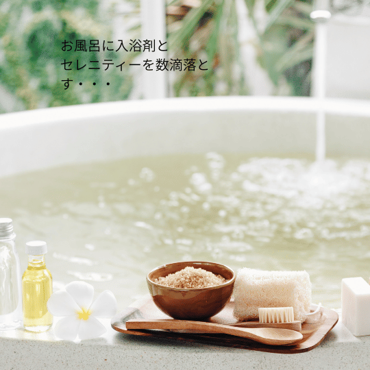 お風呂のお湯に、バスソルトや入浴剤とともにセレニティーを2〜3滴たらして入浴します。温かいお湯と香りの相乗効果で1日の疲れが和らぎ、心身ともに深いリラックス効果が得られます。