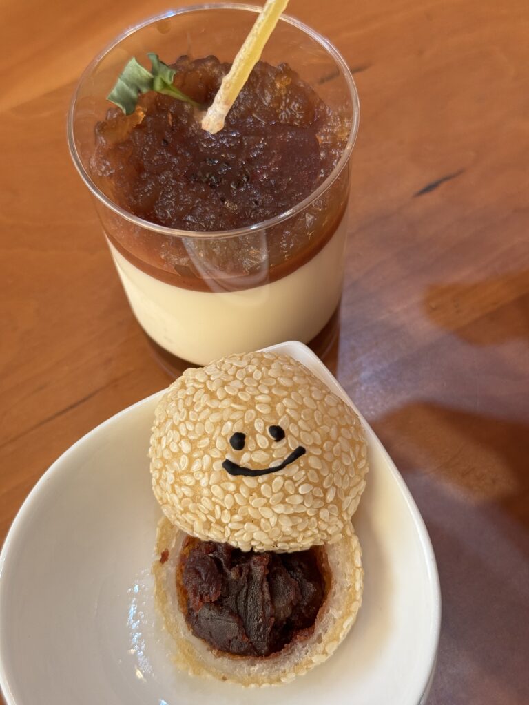 まず、にっこり笑顔のごま団子がかわいいのが魅力的😍しかし、杏仁豆腐とあんこの組み合わせが意外すぎて。優しい甘さの小倉あんと渋めに入れたアールグレーゼリー、マンゴーソース(黄色のスポイトの中にはマンゴーソースが)の酸味が加わることで、爽やかな杏仁豆腐が味変しておいしさがマシマシでした。ごま団子のもちもちした食感とごまのプチプチした食感も楽しめます。