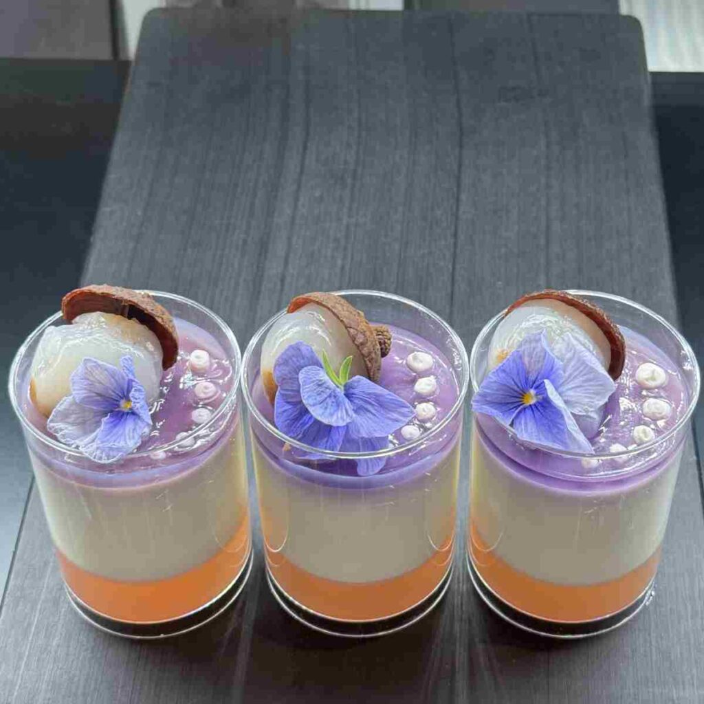 楊貴妃が好んで食べたライチですが、美容効果は未知数といわれています。アントシアニンを多く含む紫キャベツのエキスを抽出し、すみれのリキュールライチ果汁を加えたゼリーと一緒にお召し上がりください!