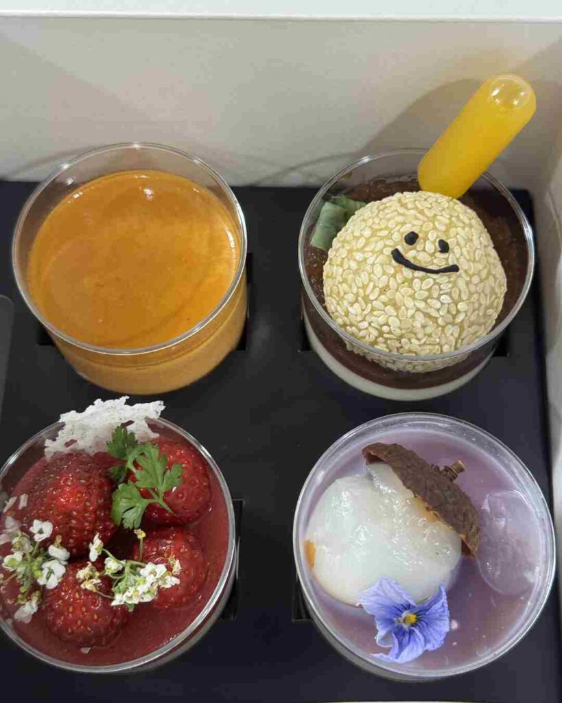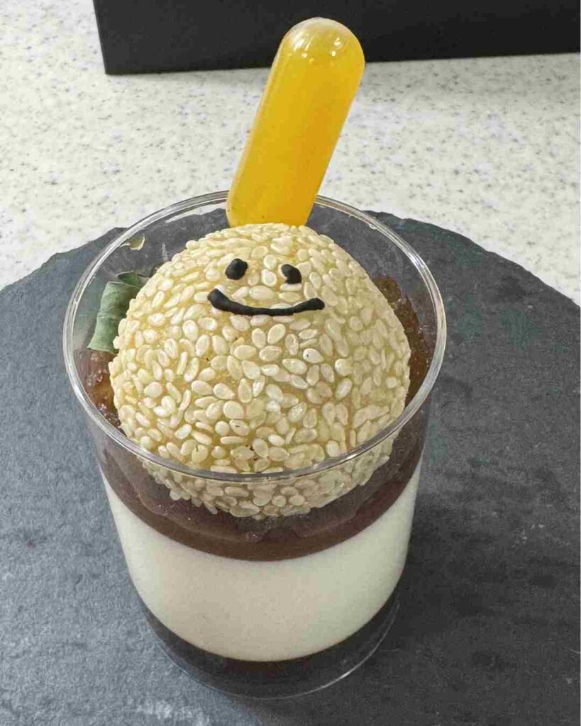 まず、にっこり笑顔のごま団子がかわいいのが魅力的😍しかし、杏仁豆腐とあんこの組み合わせが意外すぎて。優しい甘さの小倉あんと渋めに入れたアールグレーゼリー、マンゴーソース(黄色のスポイトの中にはマンゴーソースが)の酸味が加わることで、爽やかな杏仁豆腐が味変しておいしさがマシマシでした。ごま団子のもちもちした食感とごまのプチプチした食感も楽しめます。