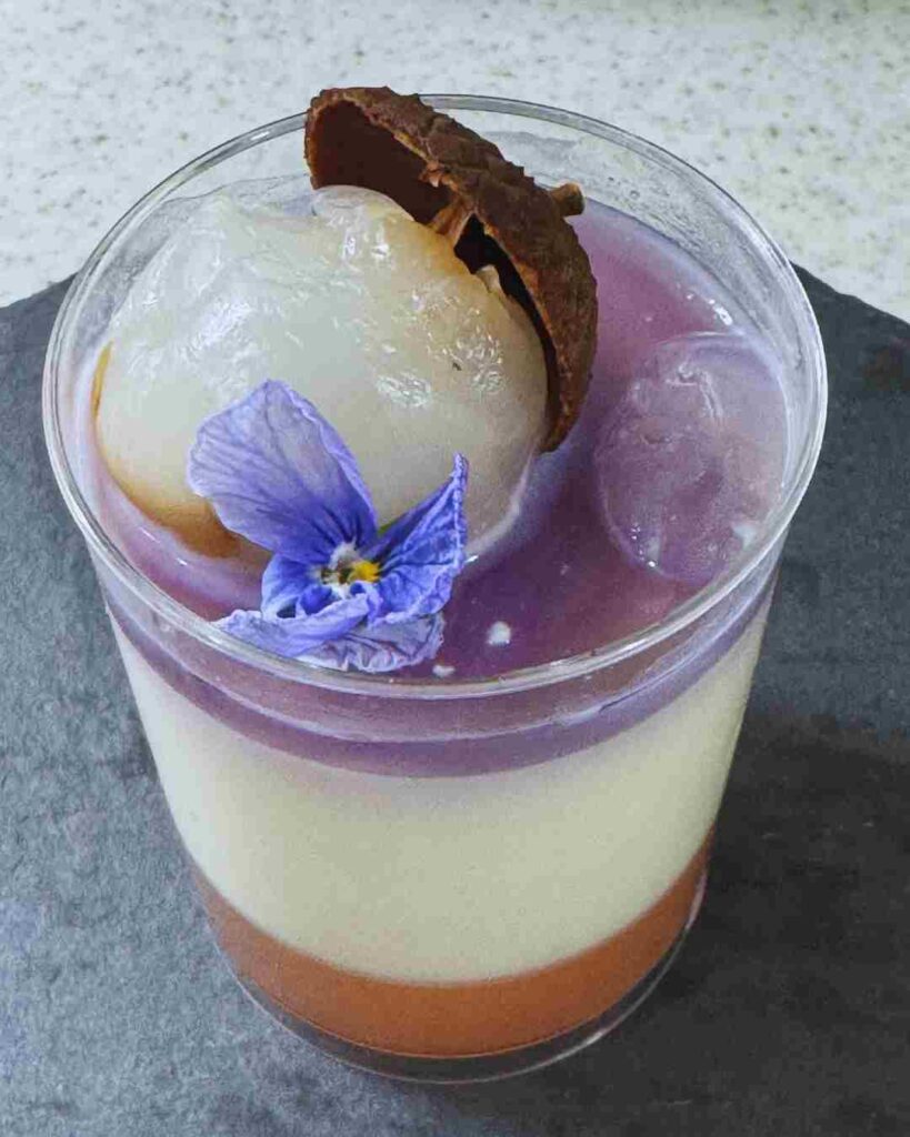 楊貴妃が好んで食べたライチですが、美容効果は未知数といわれています。アントシアニンを多く含む紫キャベツのエキスを抽出し、すみれのリキュールライチ果汁を加えたゼリーと一緒にお召し上がりください!
