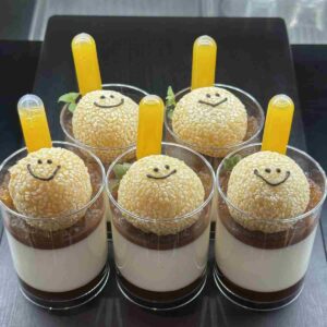 にっこり笑顔の中華点心ごま団子がのっかった杏仁豆腐。北海道産小豆を使った小倉あんにミルキーな杏仁、そして少し渋めなアールグレーのゼリーの三層構造。まさに三位一体、夢の共演をお楽しみくださいませ!