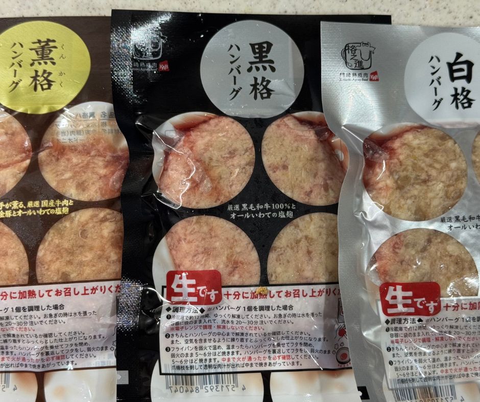 オンラインで購入した生のハンバーグは3種類。冷蔵庫で12時間かけてゆっくり解凍します。