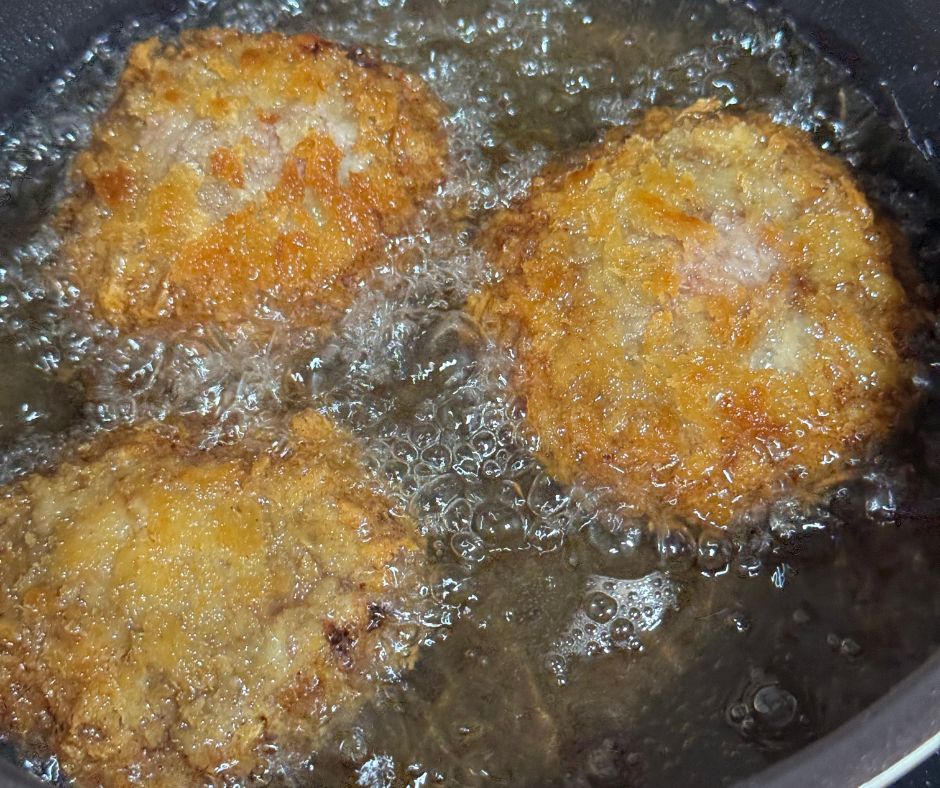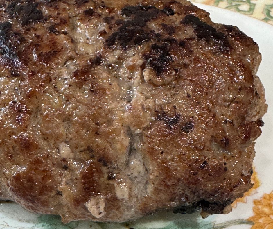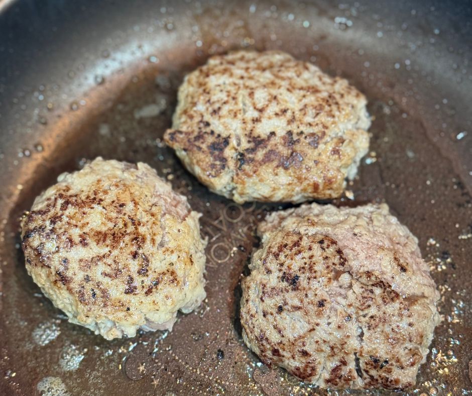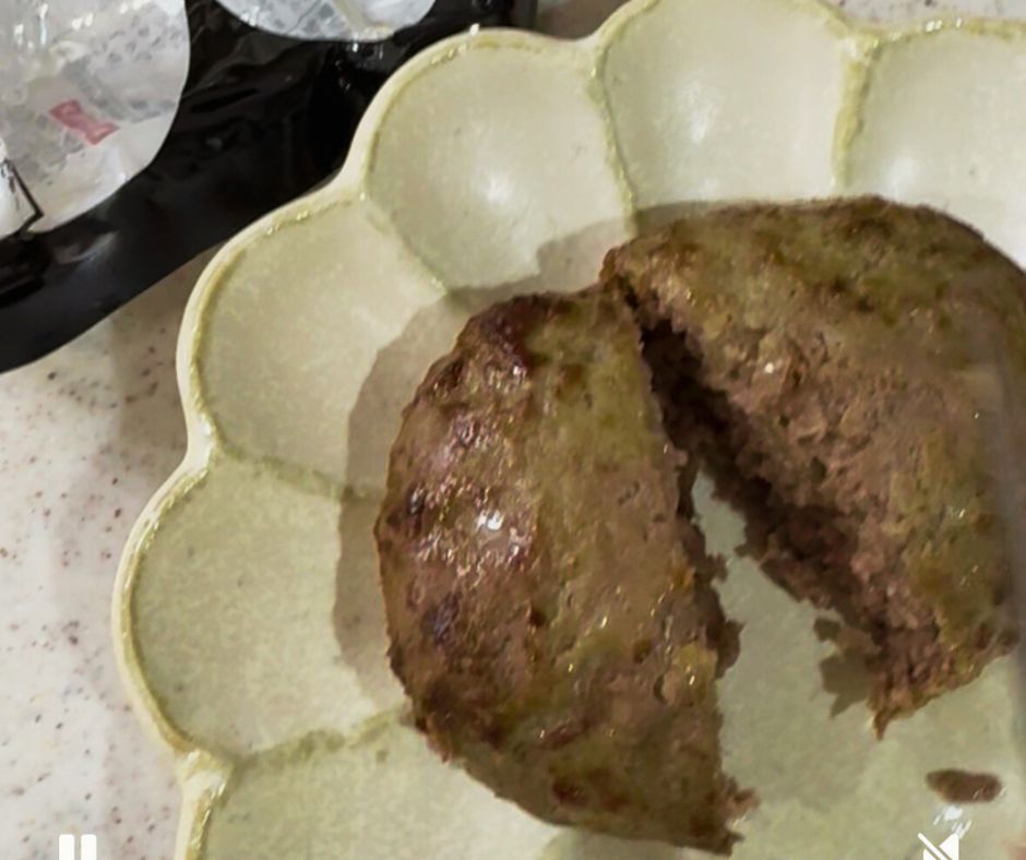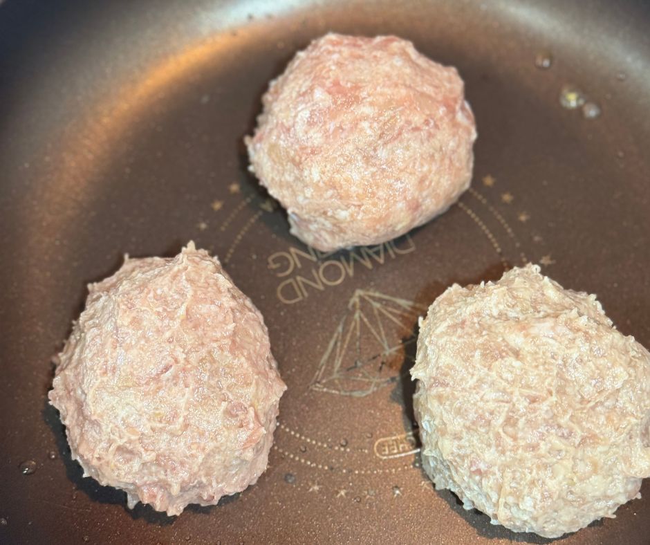 解凍したハンバーグは空気を入れるようにこね直してから焼いた方が良いそうです!油はひかずにテフロン加工のフライパンで片面6分弱火でじっくり蓋をして焼きます。