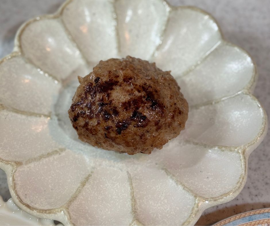 ふっくらジューシー、何もつけずに美味しいハンバーグの出来上がりです。思ったより小さめですので、育ちさ盛りのお子さんや男性には少々物足りないかもしれません。