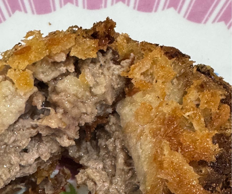 こちらはジューシーメンチカツです。パン粉はカリカリでボリューミーなメンチカツです。一つで十分な感じでした。